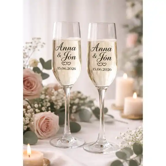 Sérmerkt kampavínsglös með nöfnum og dagsetningu – lúxus smáatriði sem varðveitir minninguna.